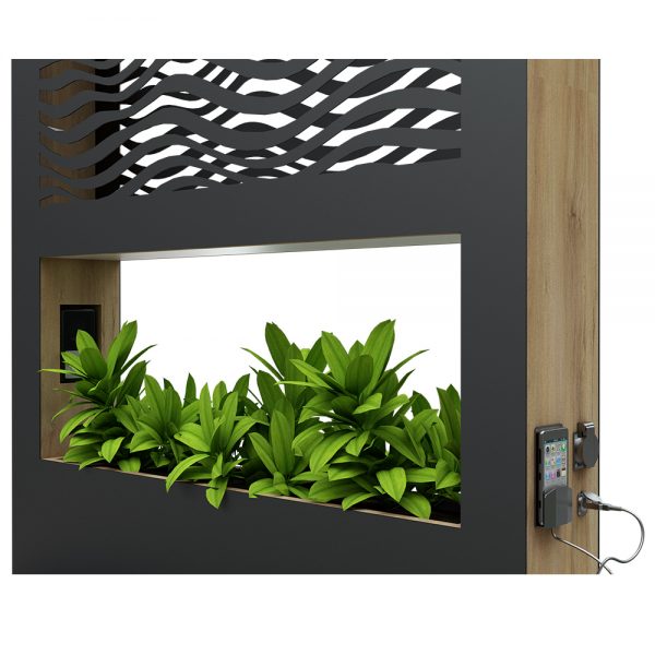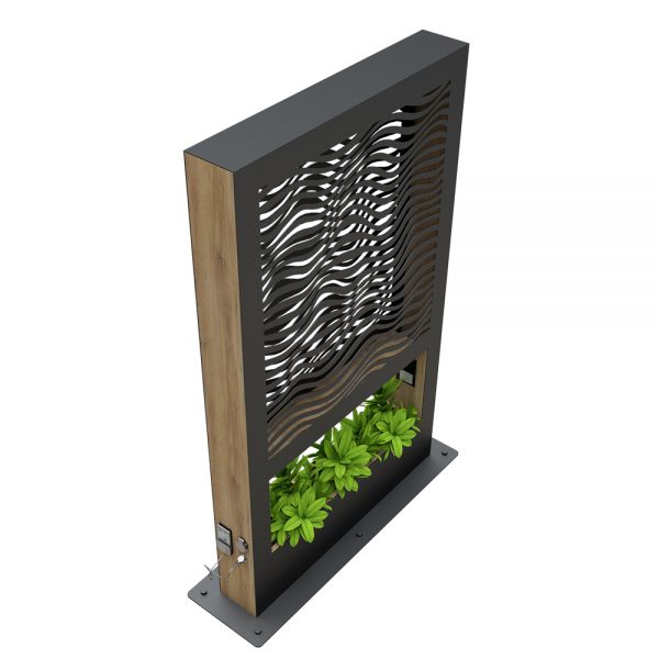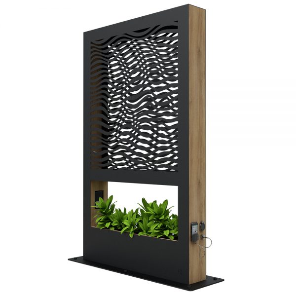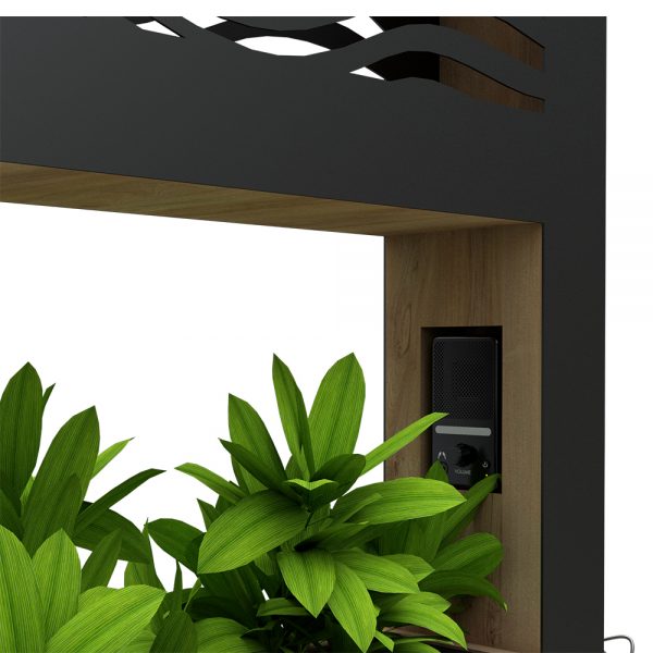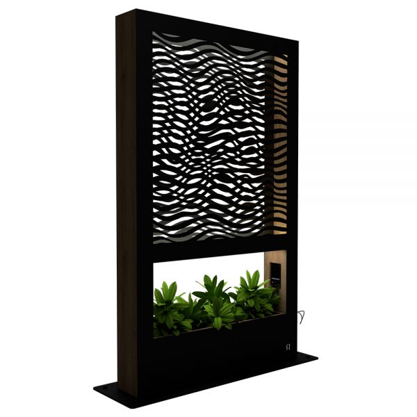 Paravan separator decorativ cu jardinieră, pentru grădină sau terasă, iluminat LED și încărcător pentru mobil inclus. Opțional, poate include boxa audio bluetooth, gama Professional, pentru exterior.